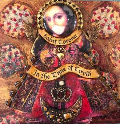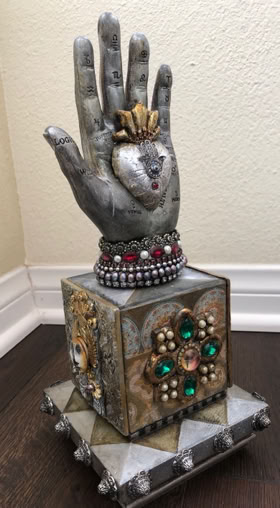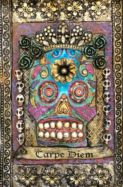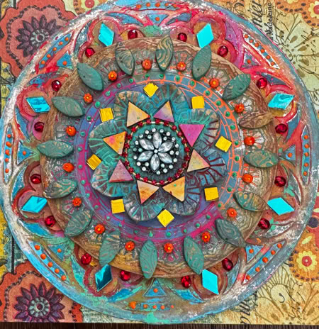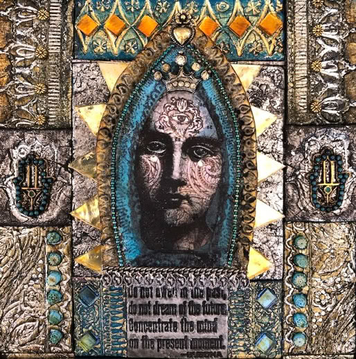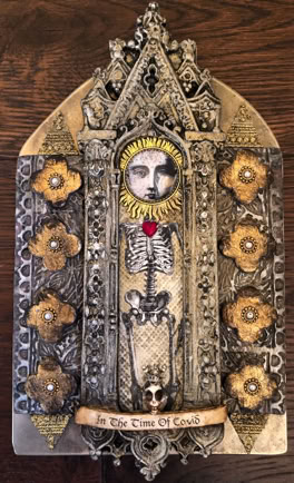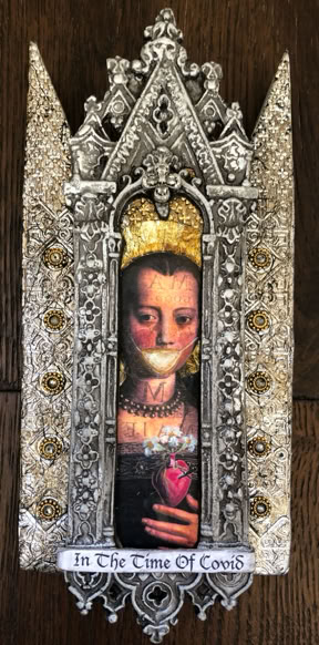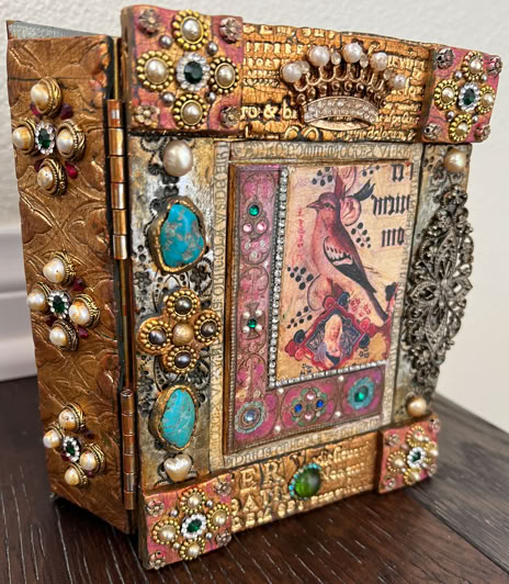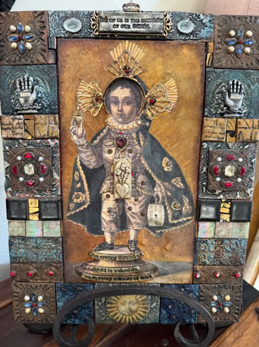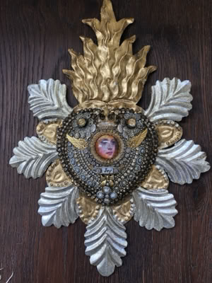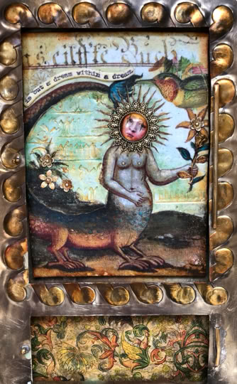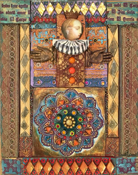 Polymer clay—still a young material within the landscape of contemporary art—has served as a powerful vehicle for invention. Early in my career, I focused on creating handmade polymer clay tiles, exploring mosaic and assemblage techniques that combined the tactile qualities of clay with materials rich in history, symbolism, and meaning. These mixed-media mosaics became the foundation of my practice and the work for which I was initially best known, culminating in the 2007 publication of my book, Mixed Media Mosaics. Over time, this process matured into a highly personal visual language—one that weaves ornament, texture, and narrative fragments into cohesive, story-driven compositions. In this early body of work, inspired by Medieval, Renaissance and Mexican folk art, the gilded devotional panels of the past became secular icons imbued with personal narratives. Sumptuously embellished surfaces, often incorporating text, merged traditional and contemporary materials. Like a modern-day alchemist tinkering with the art of the ancients, I found magic in combining these disparate elements.